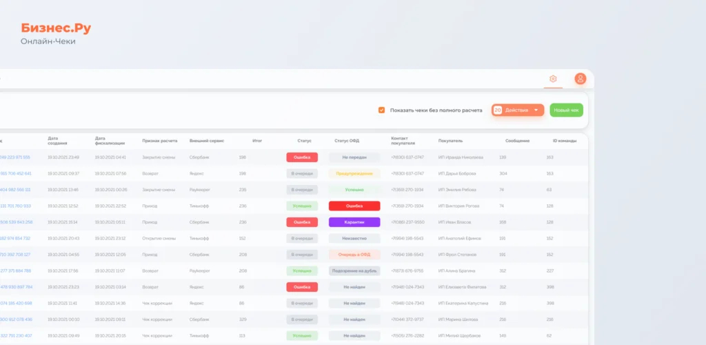 Пример ошибочных чеков в личном кабинете Бизнес.Ру