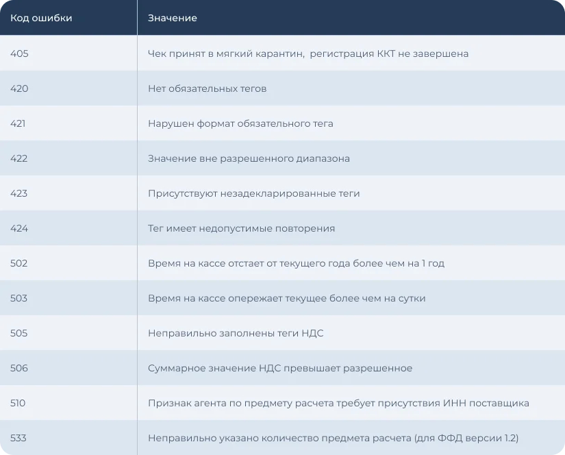 ФНС проверяет каждый кассовый документ с помощью ФЛК (форматно-логического контроля). Если чек не прошел проверку, ему присваивается код ошибки, указывающий на значение ошибки.