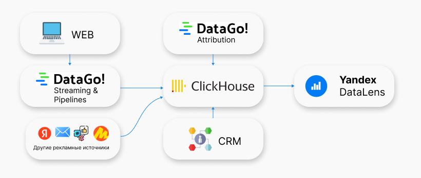 DataGo! Pipelines обеспечивает бесшовный сбор данных из различных рекламных платформ, СРА-сетей, из CRM-системы и других источников. Это позволяет командам маркетинга контролировать рекламные расходы, связывать их с доходами и повышать эффективность рекламы.