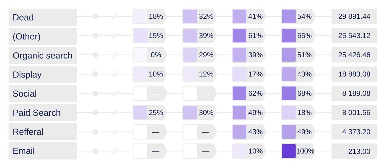 Теперь маркетинговая команда знает дополнительную ценность каждого клика и может сравнивать влияние различных источников трафика на каждом этапе маркетинговой воронки.