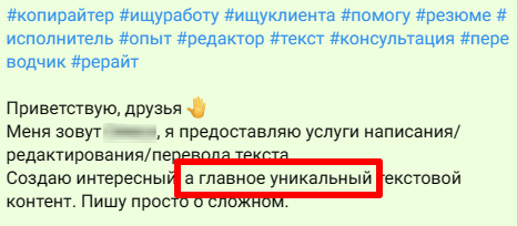 3. Фраза «Пишу уникальные тексты» выдает вчерашнего биржевика, который до сих пор считает уникальность главным критерием оценки текста. Нет, главное — польза для клиента и то, как реально работал текст — вышел в топ, привел трафик и новых лидов. Не то, что нужно сразу отказываться от сотрудничества, но лучше лишний раз перепроверить: попросить сделать тестовое, изучить портфолио.
