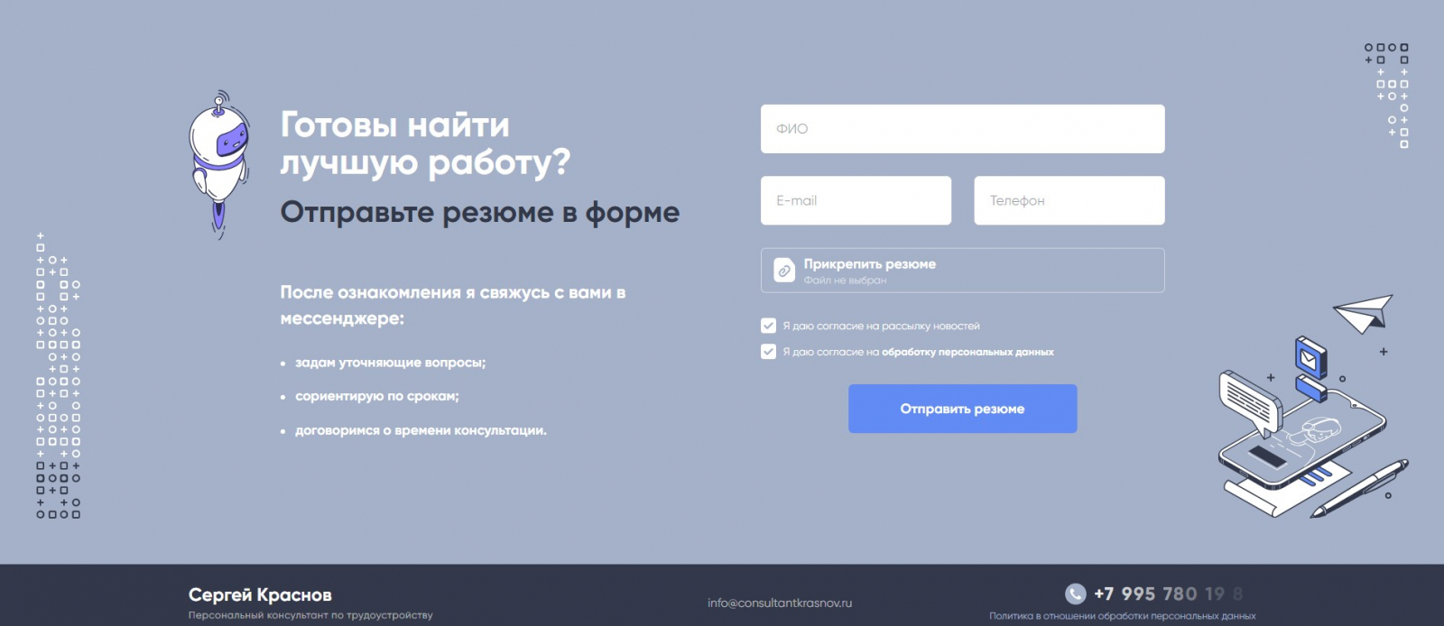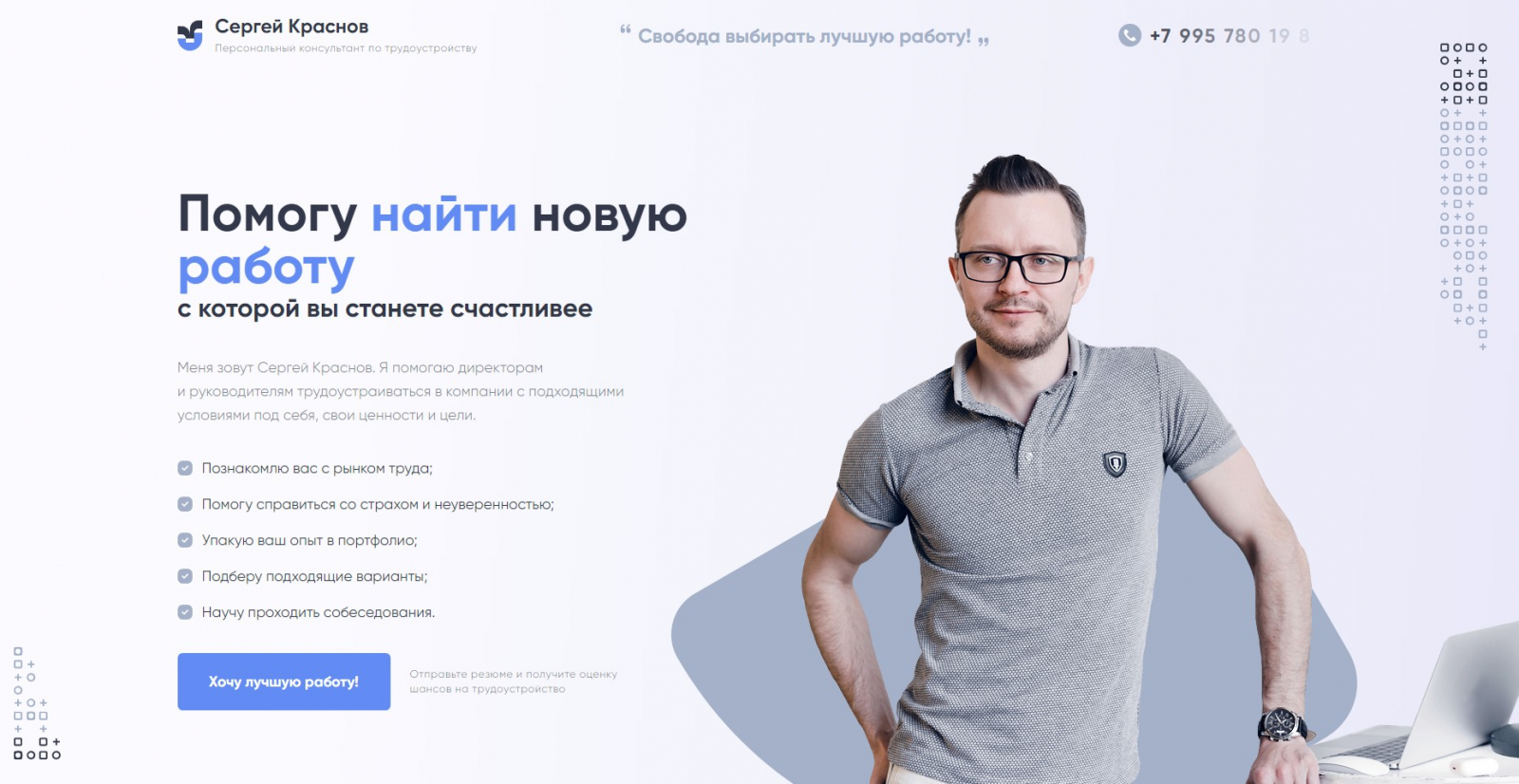 В этой статье расскажем, каким мы сделали лендинг для персонального консультанта по трудоустройству Сергея Краснова.
