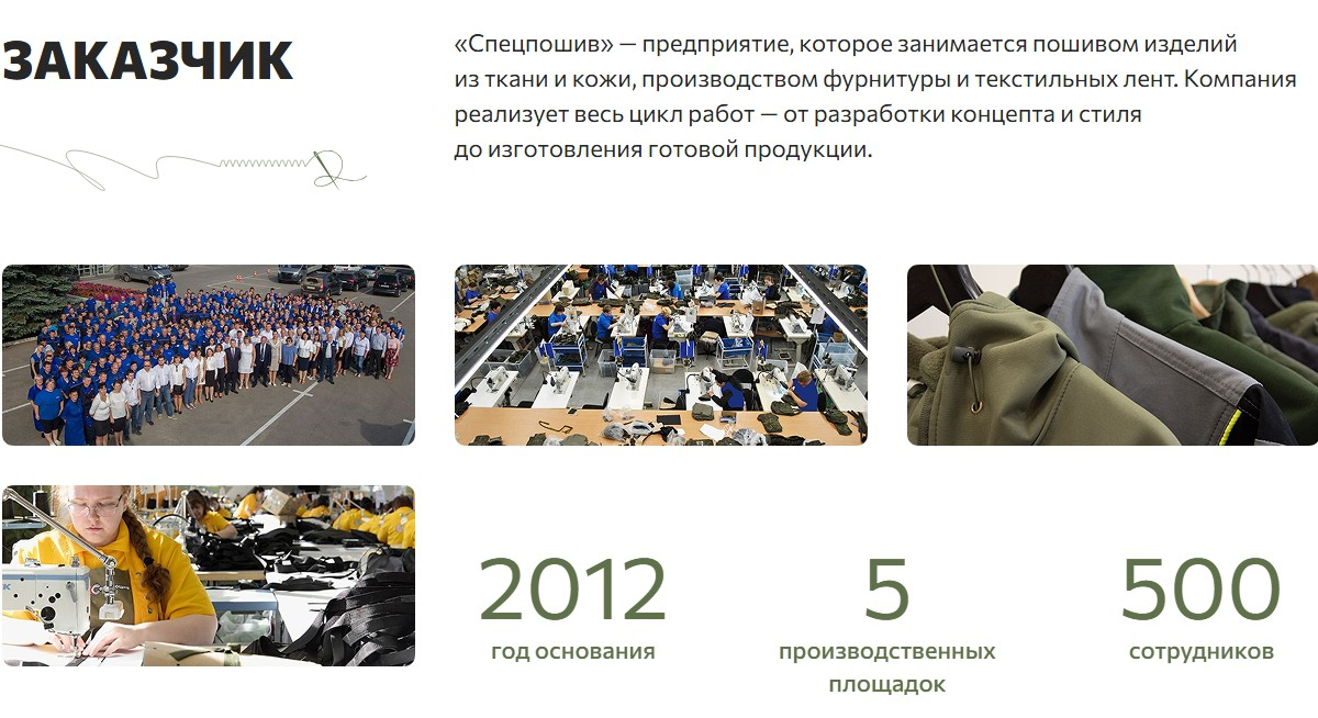 «Спецпошив» — предприятие, которое занимается пошивом изделий из ткани и кожи, производством фурнитуры и текстильных лент. Компания реализует весь цикл работ — от разработки концепта и стиля до изготовления готовой продукции.