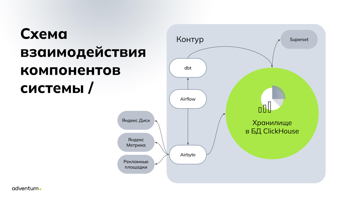 Все данные подключили к внутреннему контурному процессингу через коннекторы, после чего происходит обработка, обновление и подготовка данных для хранения в ClickHouse.