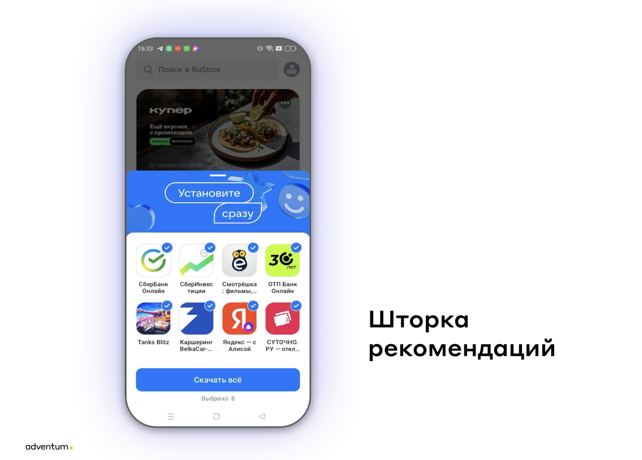 Формат представляет собой всплывающее окно, которое появляется при первом посещении магазина приложений RuStore. Пользователю сразу предлагается установить подборку рекомендованных приложений одним нажатием кнопки «Скачать всё» или выбрать из списка отдельно интересующие приложения.