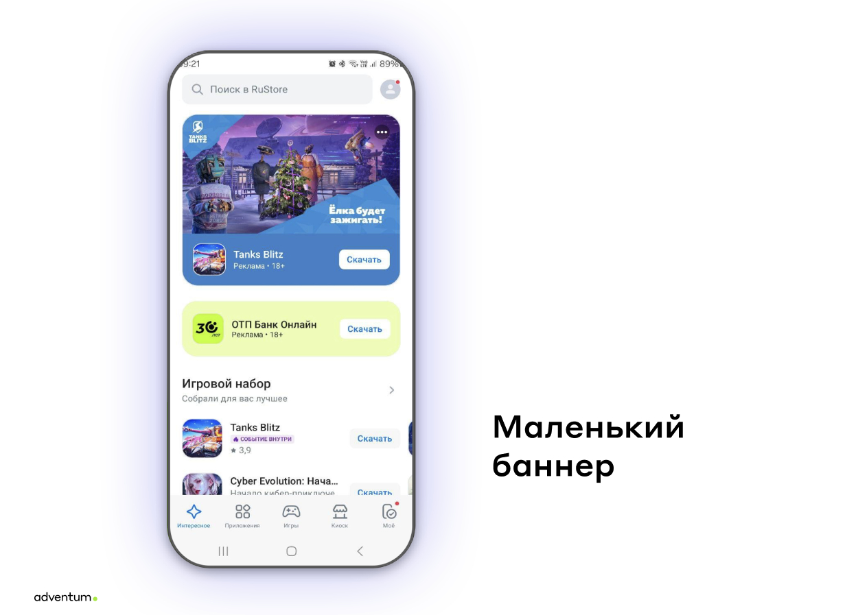 Небольшой рекламный баннер, размещенный внутри подборок приложений в магазине RuStore. Баннер отображается среди приложений похожей или тематической категории. При клике пользователь попадает на страницу приложения и может сразу его установить.