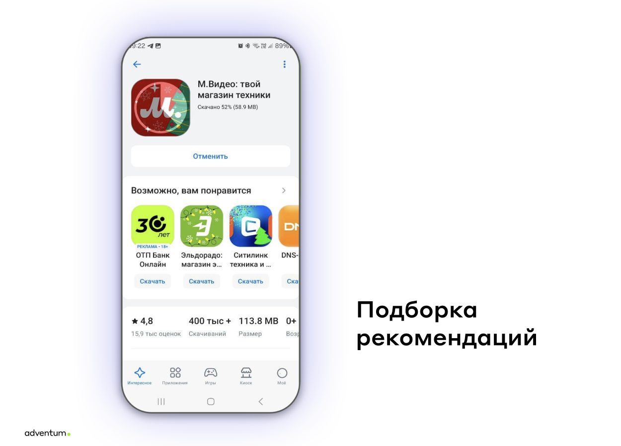 По объему охвата RuStore пока не конкурирует с крупными сетями, но уже может входить в медиасплит мобильного продвижения для решения задач на нижних уровнях воронки. Платформа предустанавливается на все Android-смартфоны в России и становится одним из ключевых магазинов приложений на рынке.