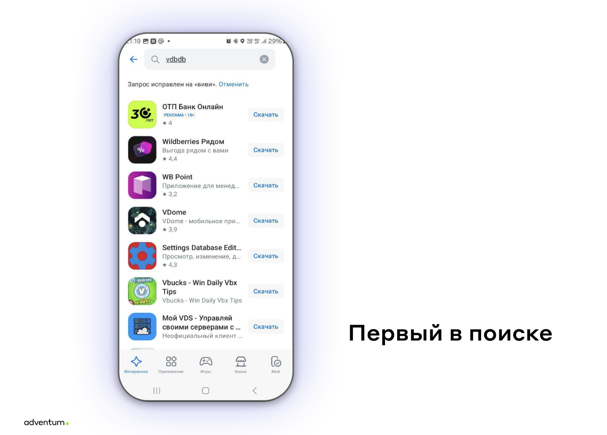 Этот формат обеспечивает приоритетное размещение приложения на первом месте в результатах поиска по определенным ключевым словам или категориям (например, «банки», «финансы»). Пользователи, которые ищут приложения по тематике, сразу видят предложение банка в верхней части экрана.