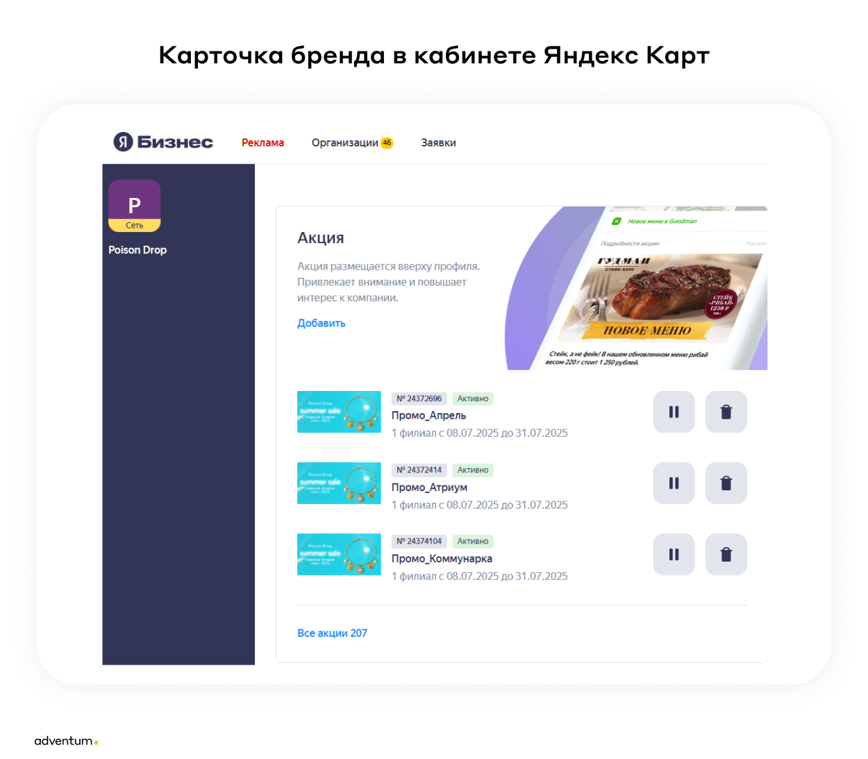 Запустили брендированное приоритетное размещение филиалов Poison Drop в Яндекс Картах. Это формат, который визуально выделяет карточку компании с помощью логотипа, витрины товаров, акций и кнопки действия.