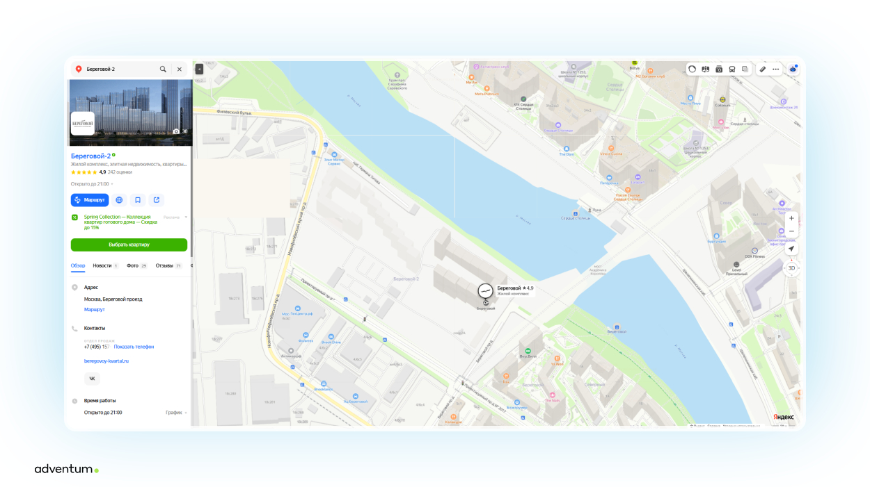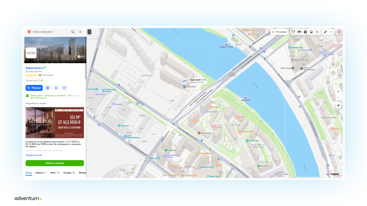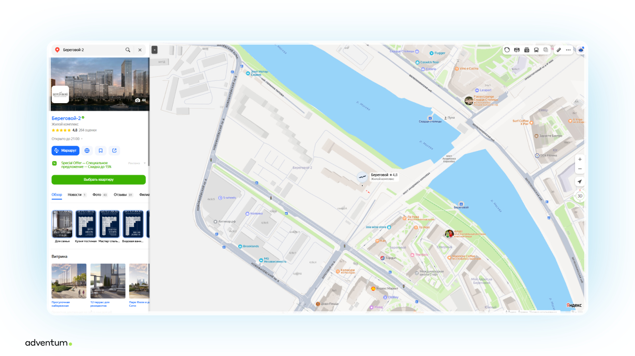 «Яндекс Карты — уже давно базовая часть воронки продаж в категории недвижимость. Фактически карточка жилого комплекса — альтернатива брендовой выдаче контекстной рекламы. Однако в отличие от контекста, формат обладает элементами вовлечения: историями, новостями и другими инструментами. Команда Adventum помогла нам развивать инструмент: от подготовки контента карточки и запуска до регулярных и своевременных обновлений. В результате мы получили измеримый рост охвата и конверсий».