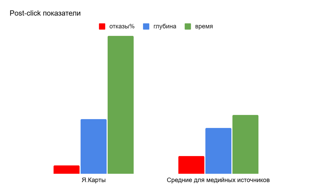 Чтобы оценить качество аудитории, сравнили данные Яндекс Метрики за период апрель — декабрь 2025: отдельно источник Яндекс Карты и средние значения для медийных источников без учета контекста. Карты показали эффективный результат: