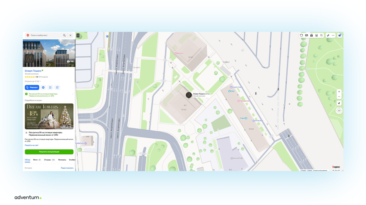 При гео-размещении могут быть важны даже небольшие детали. Так, например, для застройщика необходимо обращать внимание в том числе на формат макетов в витрине. По опыту размещения Dream Towers и других объектов специалисты Adventum отметили более высокую эффективность брендированных планировок в витрине.