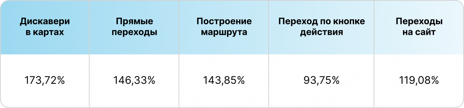 Во-первых, за период размещения произошел значительный прирост дискавери-переходов, что отображает успешный охват новой аудитории, которая не имела прямой цели найти данный ЖК, но была заинтересована в локации. Во-вторых, по результатам размещения более чем в 2 раза выросли как прямые переходы, так и количество построения маршрутов. Данная динамика подтверждает, что застройщику удалось повысить узнаваемость бренда и сформировать интерес к локации и ЖК.