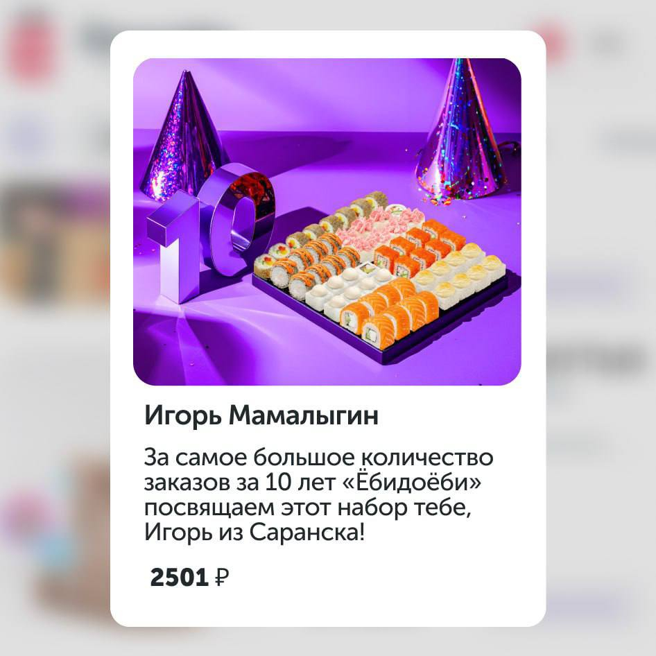 И чтобы поблагодарить Игоря за его вклад в развитие бренда, компания назвала в его честь целый сет роллов. И это пример реально классного и доброго креатива, которого сейчас остро не хватает в инфополе. Непонятно лишь одно: получит ли Игорь Мамалыгин свой сет в подарок?