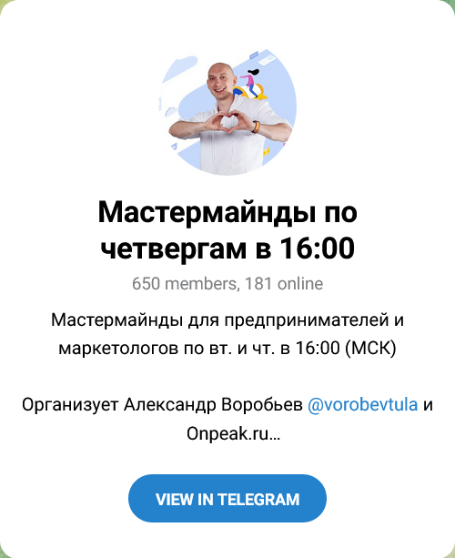 Эту подборку телеграм-чатов про бизнес подготовил для вас Александр Воробьев, руководитель агентства Onpeak.ru. Присоединяйтесь к моему чату предпринимателей, и давайте вместе развиваться и достигать новых вершин!