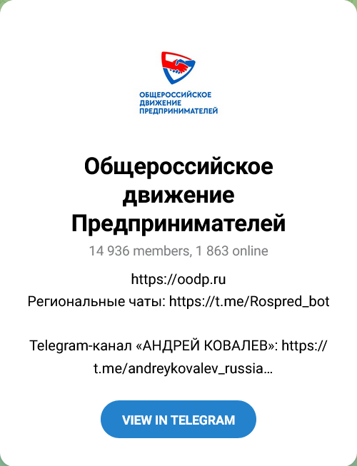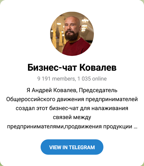 Телеграмм-чат Андрея Ковалева, Председателя Общероссийского движения предпринимателей, для налаживания связей между предпринимателями,продвижения продукции и услуг, а также для поиска партнеров и инвесторов.