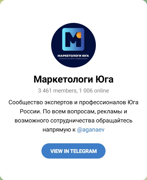 Сообщество экспертов и профессионалов из южных регионов России, объединенных интересом к маркетингу и бизнесу. Хотя акцент сделан на маркетологах Юга России, на самом деле в чате огромное количество специалистов из других регионов. Чат лишен спама, а общение в чате выходит далеко за рамки только маркетинга. Участники активно обсуждают бизнес-задачи, делятся успешными кейсами, задают вопросы по управлению проектами и предпринимательству.