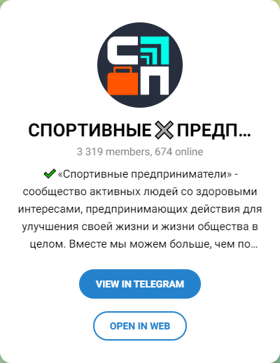 Чат для предпринимателей, ведущих активный образ жизни. В данном канале можно встретить людей разных профессий: спортсмены, бизнесмены, юристы, бухгалтеры, и все они ведут здоровый образ жизни, параллельно работая в своей сфере.