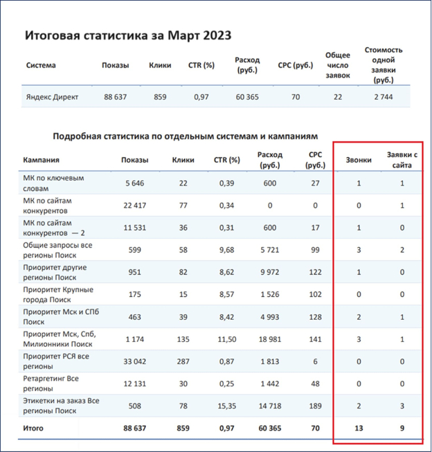 По каждой рекламной кампании фиксируются результаты, чтобы в будущем исключать неэффективные таргетинги.