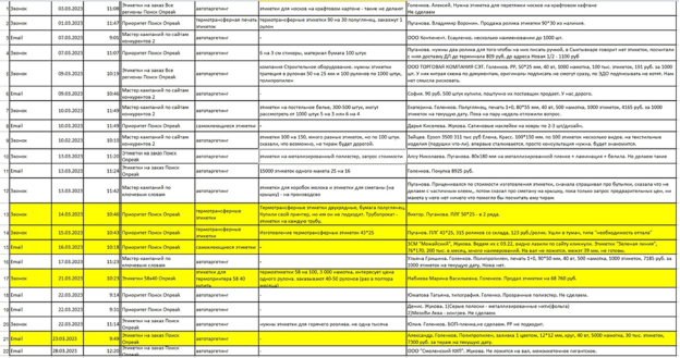 После сбора данных, заказчик отметил жёлтым цветом те заявки, которые счёл интересными. Остальные были либо слишком мелкими, либо невыполнимыми.
