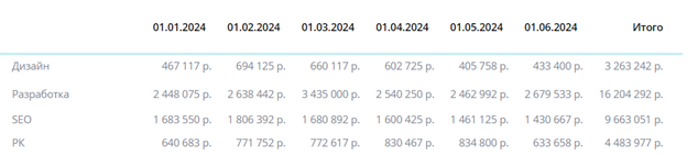 Эти показатели демонстрируют доход и рентабельность компании. В нашем агентстве значительную долю выручки приносят проекты с ежемесячной оплатой: SEO, управление рекламными кампаниями, поддержка репутации и другие услуги, представленные в виде абонементов. Средний диапазон таких контрактов составляет 30 000–150 000 рублей в месяц, включая услуги аутстаффинга.