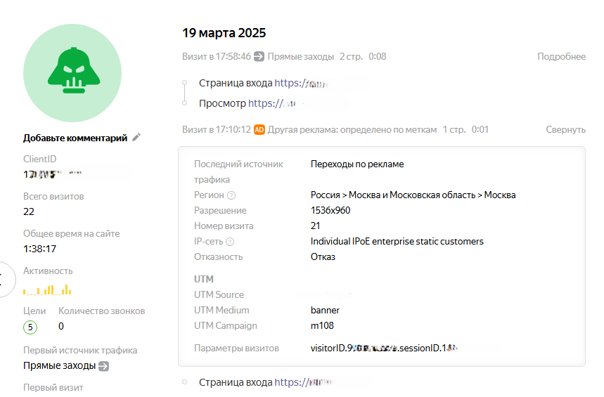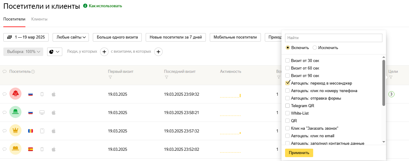 Далее мы посмотрели в Метрике отчёт “Посетители и клиенты”. Нашли ближайший по времени визит с выполнением конверсии «Автоцель: Переход в мессенджеры» (ближайший ДО появления заявки в CRM).