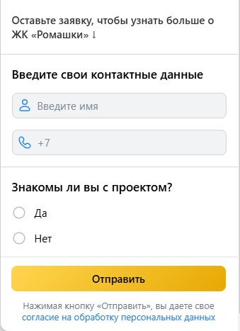 Для сегментации аудитории в форме добавлены поля с контактными данными и вопрос о знакомстве с проектом. Это позволяет на этапе сбора заявок понимать уровень осведомленности потенциального клиента и в дальнейшем строить более персонализированную коммуникацию.