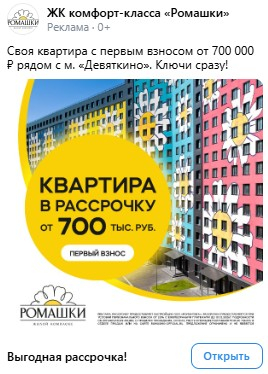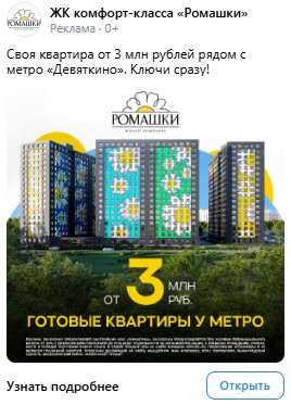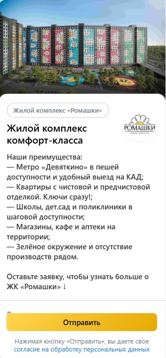 Для рекламной кампании была подготовлена универсальная лид-форма, подходящая для широкой аудитории с разными интересами и потребностями. На обложке использован логотип проекта и визуализация фасада комплекса, что способствует узнаваемости и повышает доверие к бренду. В тексте перечислены ключевые преимущества: близость к метро «Девяткино» и удобный выезд на КАД, квартиры с отделкой «под ключ», наличие школ, детских садов и поликлиник в шаговой доступности, а также зелёное окружение и отсутствие промышленных объектов рядом.