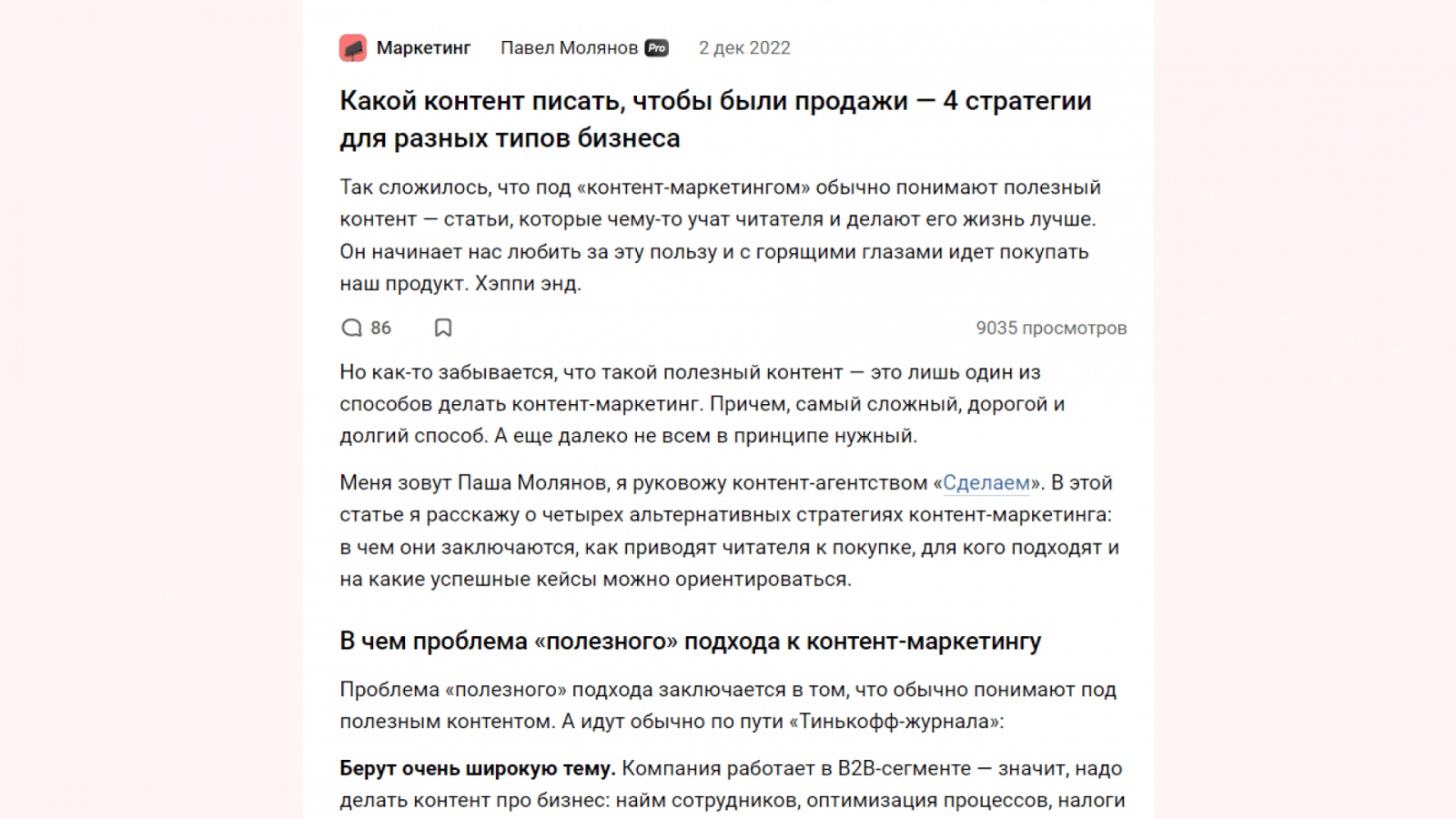 «Сделаем», агентство контент-маркетинга. Однажды я опубликовал статью «Какой контент писать, чтобы были продажи — 4 стратегии для разных типов бизнеса». Она рассчитана на тех, кто уже делает контент, но не видит от него результата. Там я предлагаю решить проблему, создав подходящую для своего продукта контент-стратегию.