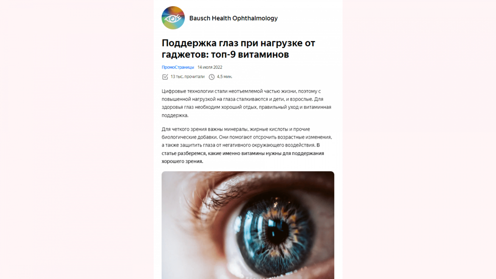 «Бауш Хелс», продажа БАДов. В статье «Поддержка глаз при нагрузке от гаджетов: топ-9 витаминов» компания показывает, что если у тебя болят глаза от гаджетов (проблема), помочь могут витамины (способ решения).