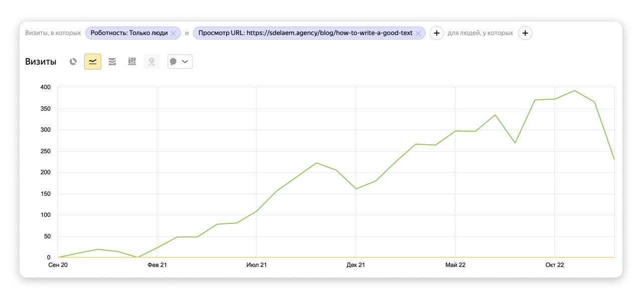 Посмотрите для примера на статистику поискового трафика по одной из наших статей. Мы опубликовали ее в сентябре 2020 года — и до июля 2021 года получали меньше 100 просмотров в месяц. Прошел почти год, прежде чем начался всплеск трафика.