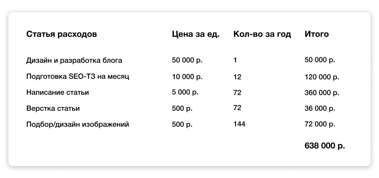И самое главное: чтобы писать хорошие статьи, нужны эксперты — давать авторам интервью и проверять факты в статьях. Обычно экспертами становятся сотрудники компании: дают интервью авторам и потом проверяют факты в получившемся тексте. Подготовка, само интервью и проверка — это около 3 часов на статью или 216 часов в год для блога на 6 статей в месяц. Посчитайте сами, сколько это в деньгах для вашей компании.