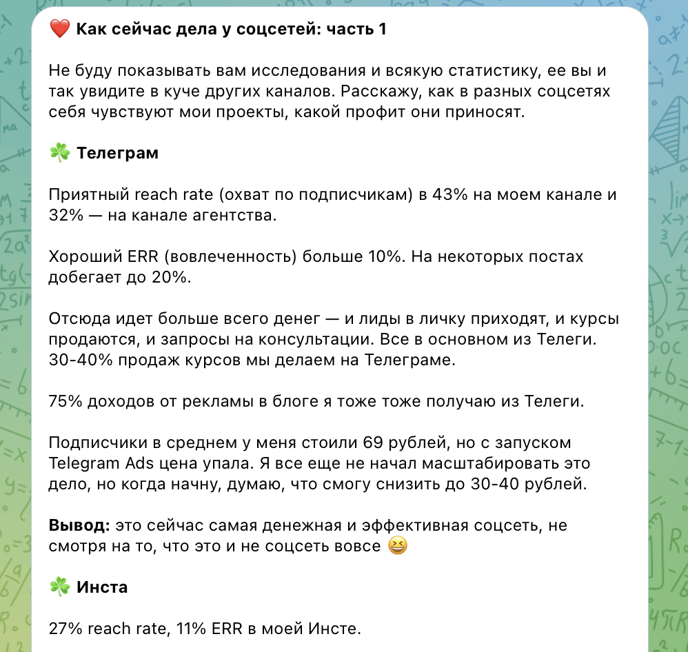 Я пользуюсь обоими методами: и покупаю рекламу на свой Телеграм, и публикуюсь в СМИ. Статья, которую вы сейчас читаете — это как раз часть моей «экспертной» контент-стратегии =)