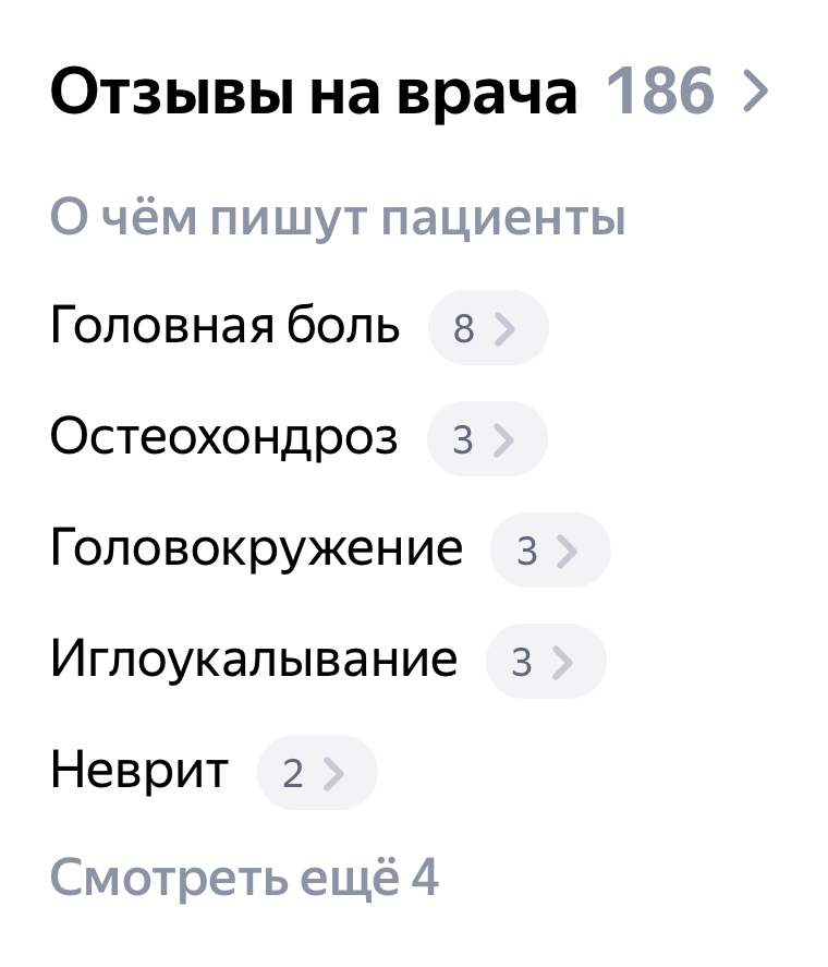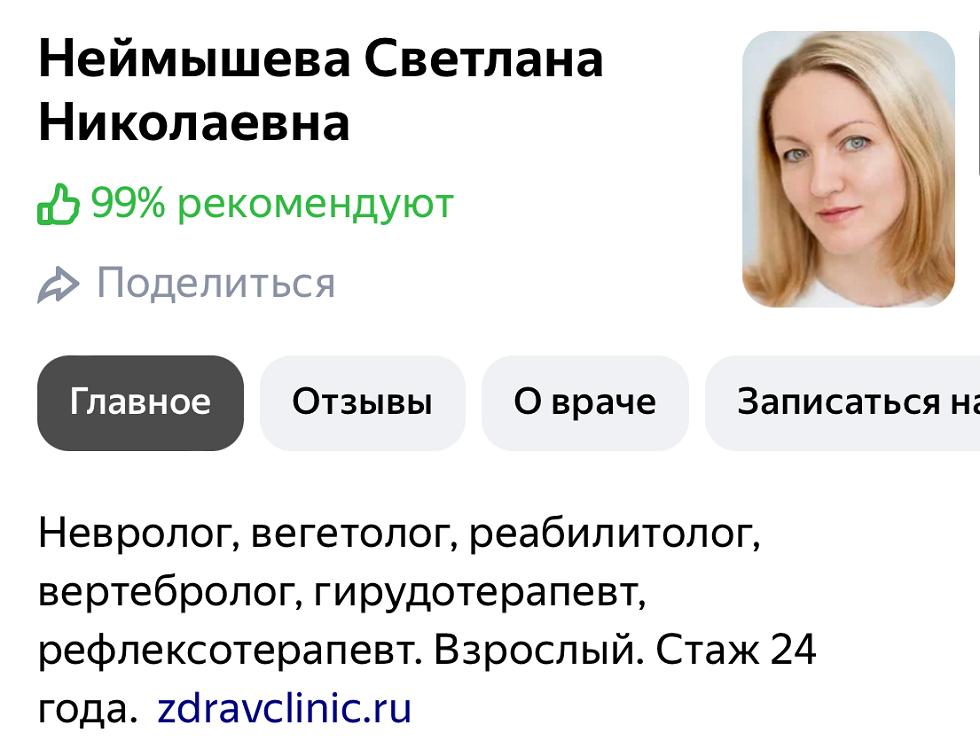 Отзывы также подтягиваются в профиль автоматически. Яндекс их формирует из карточек клиник на Яндекс Картах, где упоминают врача, а также из других профильных сайтов-отзовиков, например, napopravku.ru. Верифицированные доктора могу самостоятельно отвечать на отзывы о себе.