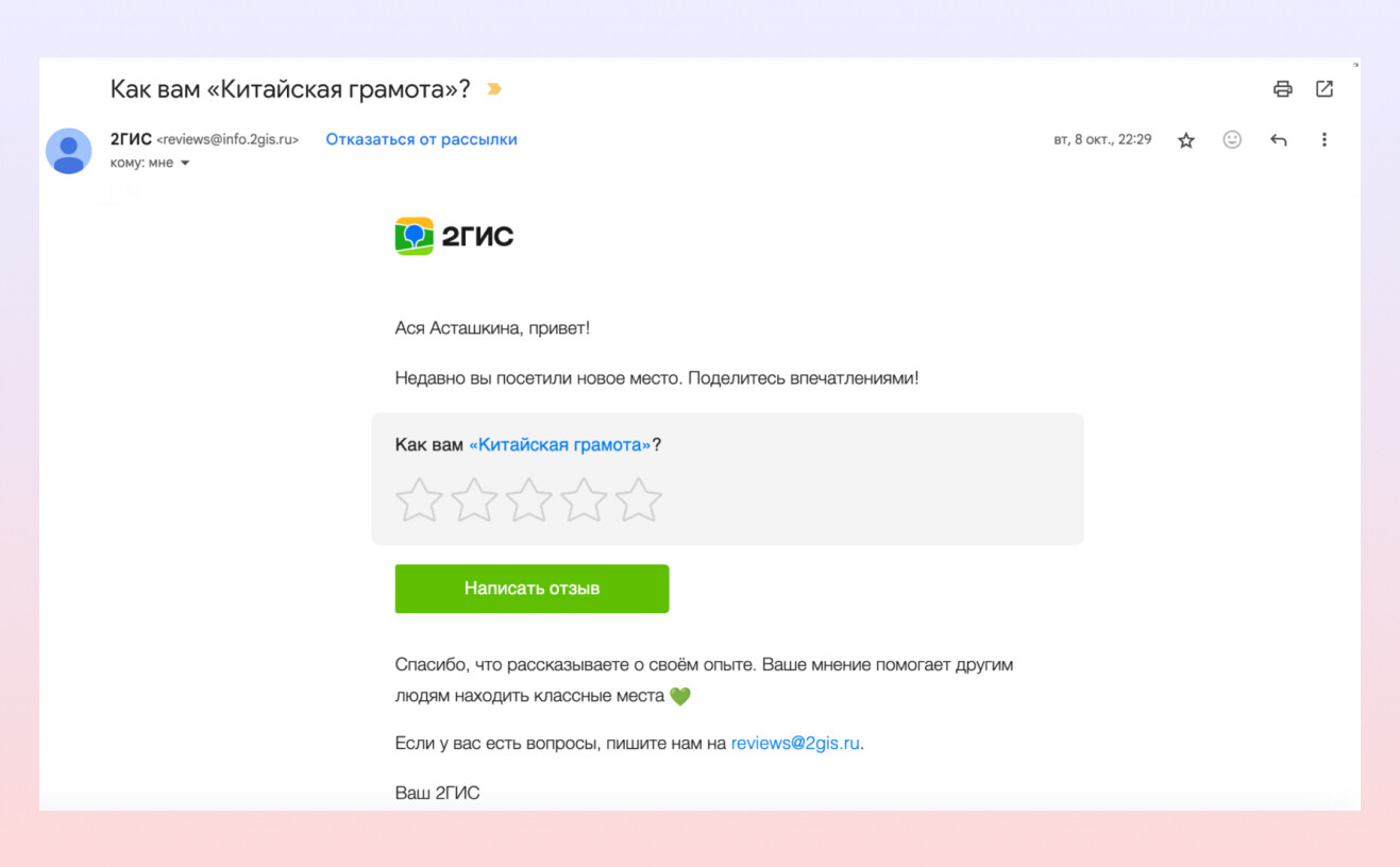 Геосервис будет рассылать на электронные почты пользователей письма с запросом на отзыв. Рассылка придет получателю спустя несколько дней после посещения локации.