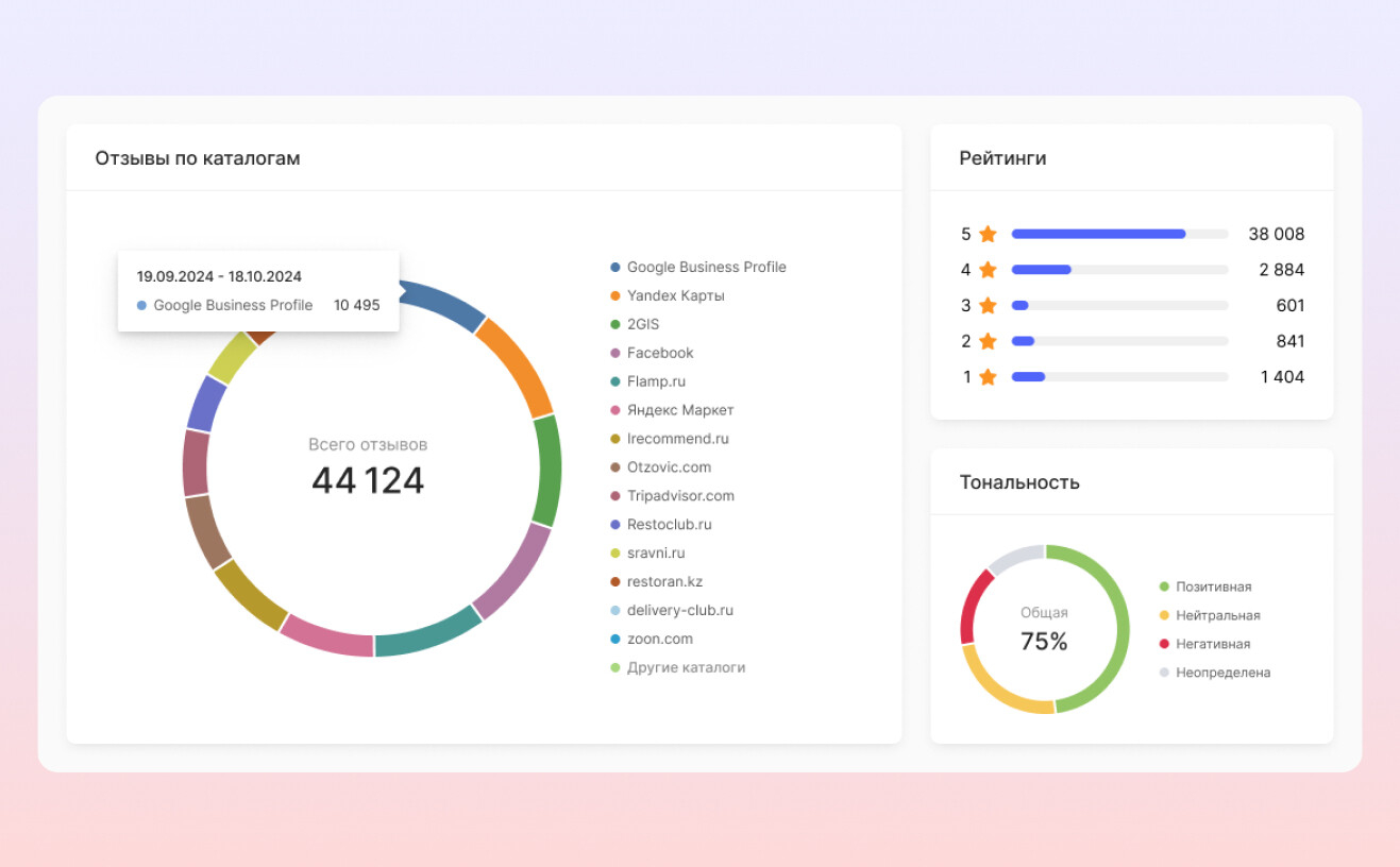 В блоках вы найдете обзор по отзывам со всех источников и ответов на них за нужный вам период и узнаете, как распределяются все отзывы по рейтингу и тональности. Наглядные данные нового отчета помогут оценить работу с отзывами и скорректировать репутационную стратегию.