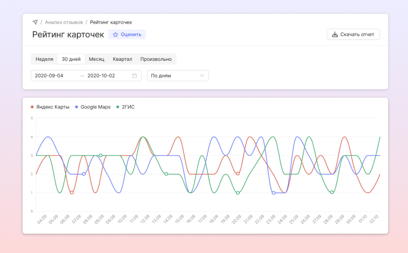 Осенью в RocketData появилось еще одно обновление, которое позволяет отслеживать изменения рейтинга всех ваших локаций в 2ГИС, Яндекс и Google и оперативно реагировать на их снижение.