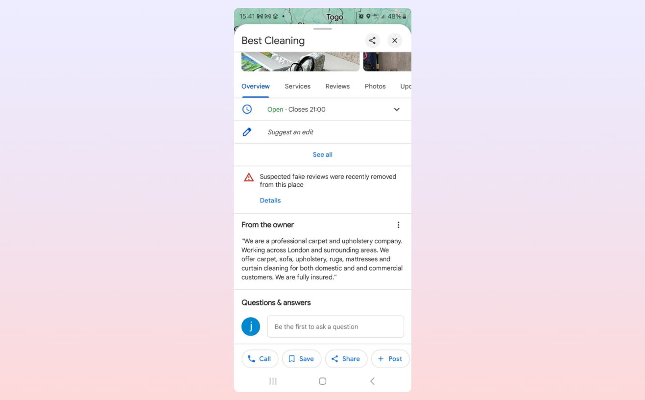 В карточках некоторых компаний теперь появились уведомления о том, что в профиле организации были опубликованы фейковые отзывы. На это обратили внимание пользователи в Великобритании.