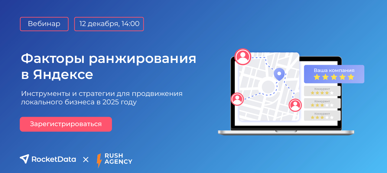 Приглашаем на вебинар RocketData и Rush Agency о факторах ранжирования в Яндекс для локального бизнеса, которые помогут вам продвигаться на картах и в поиске в 2025 году.