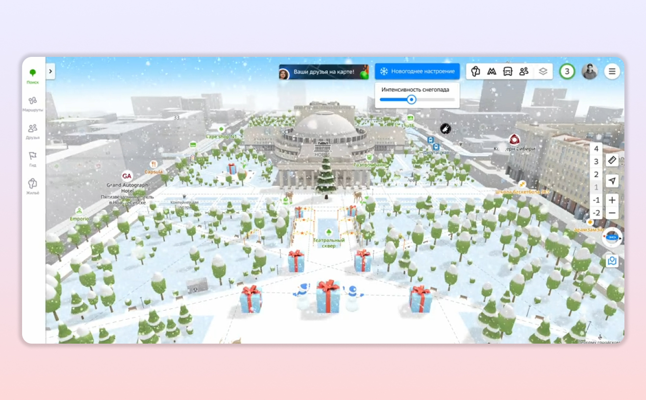 В преддверии праздников геосервис добавил на карты много новогодних фишек. Так, на картах можно активировать зимний слой со снегопадом и увидеть множество декоративных тематических элементов. Праздничное настроение появилось и в Навигаторе: вместо стандартного курсора — Дед Мороз в санях, а в Друзьях на карте — «Морозный эффект» и праздничный набор стикеров.