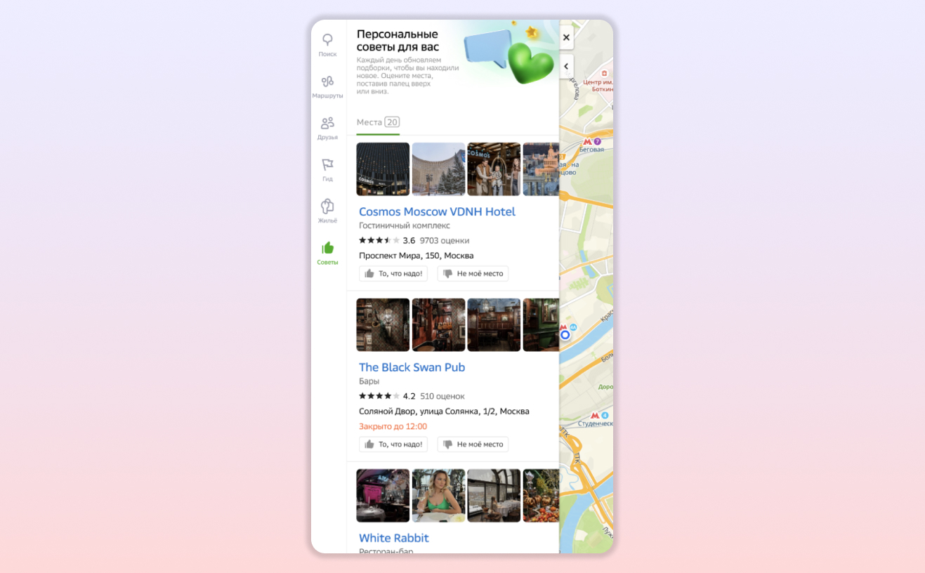 Напомним, что похожий функционал есть и в Яндекс Картах — геосервис предлагает персональные рекомендации организаций на основе взаимодействий пользователя с карточками (маршруты, история поиска, оценки и др.)