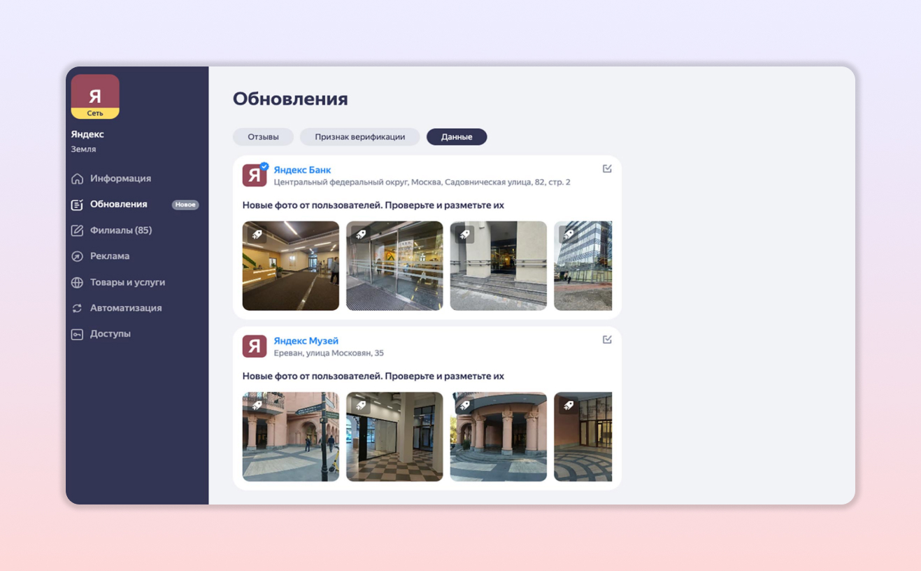 В личном кабинете Яндекс Бизнеса появился раздел «Обновления» для сетевых организаций. В нем можно работать с отзывами, статусом верификации и медиаконтентом для всех филиалов.