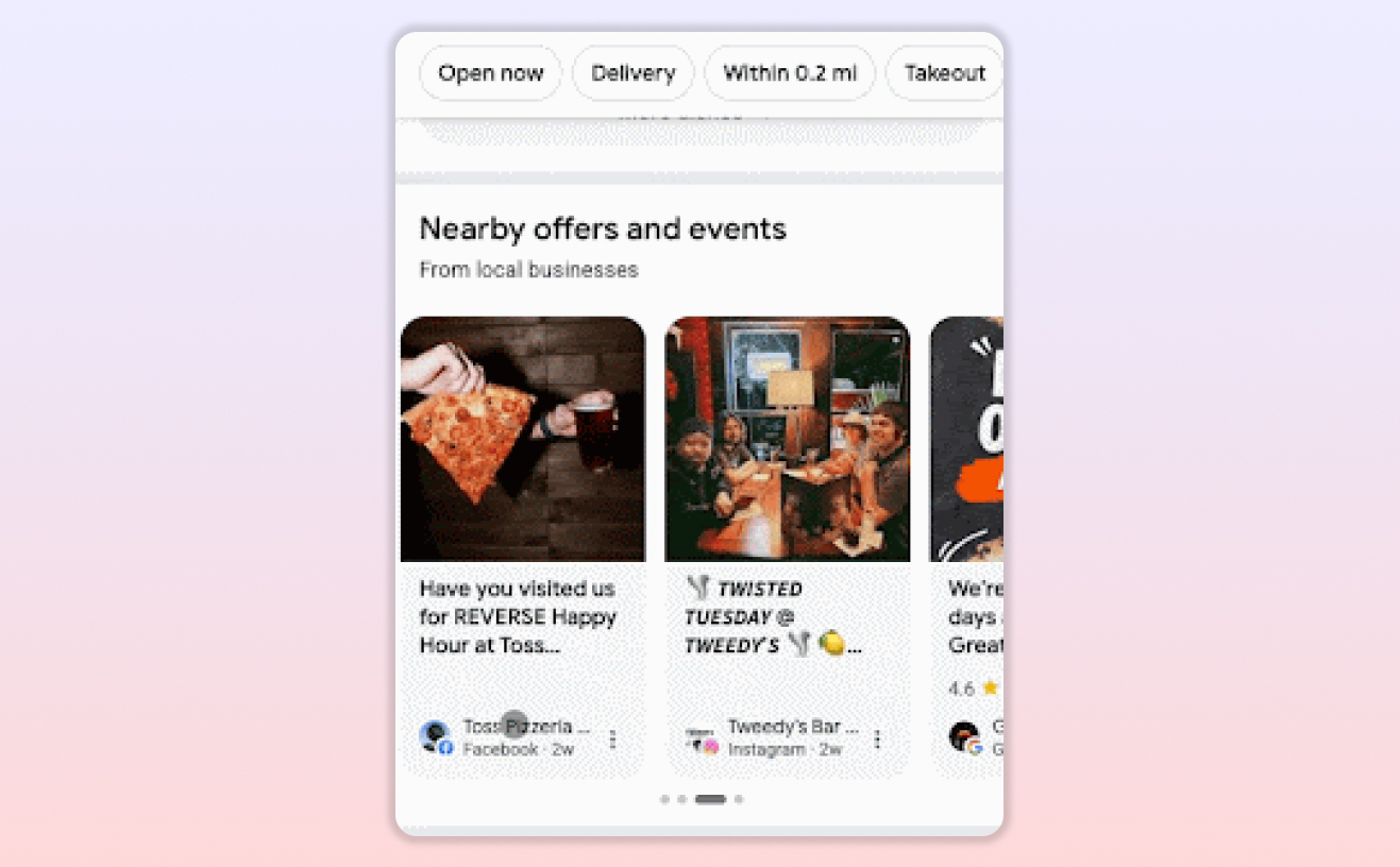 В поиске в карусели пользователям будут показываться новости находящихся поблизости кафе и ресторанов. Так клиенты смогут узнать, например, в каких заведениях на момент поиска действуют спецпредложения.