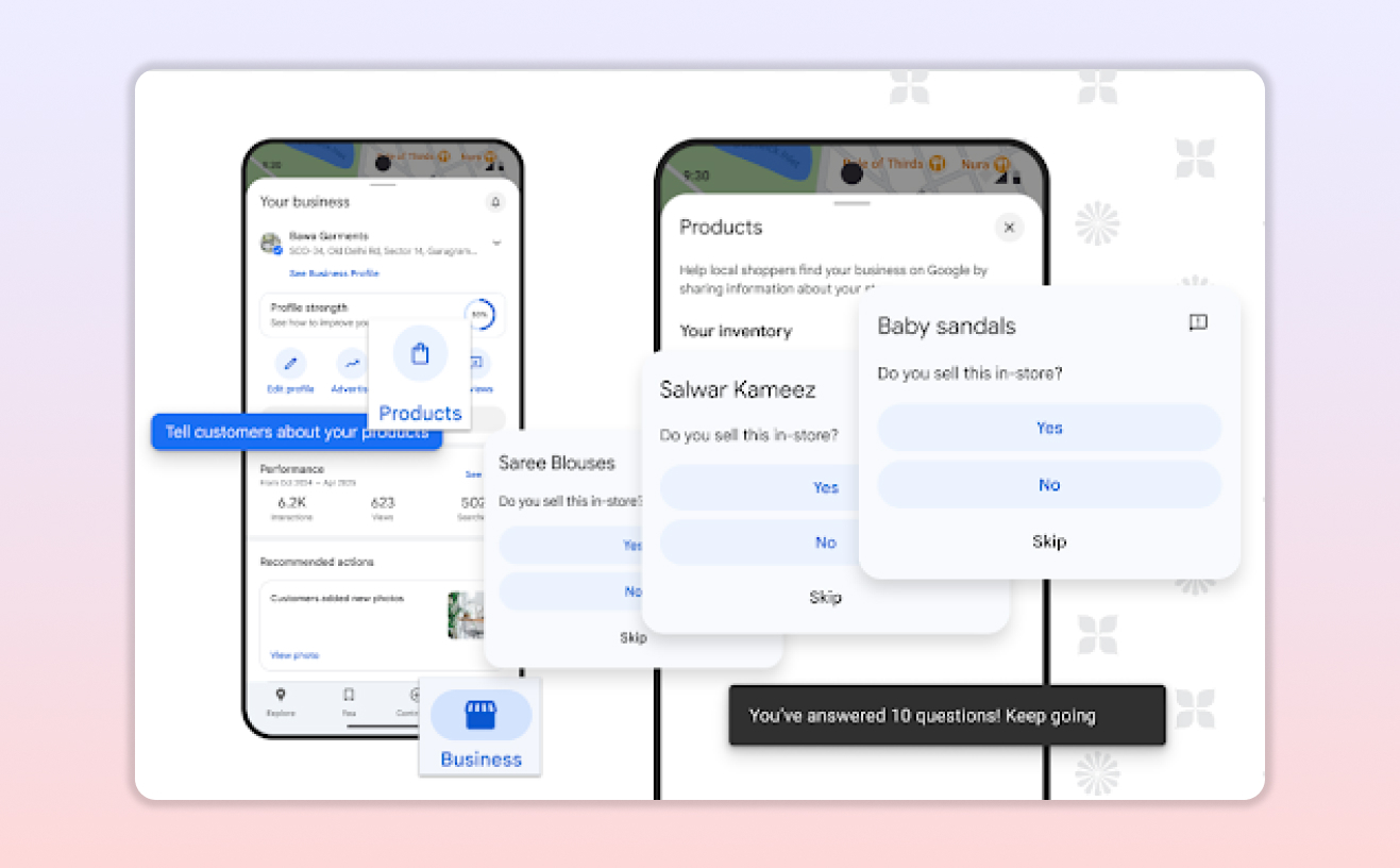 Google оптимизировал процесс заполнения информации о товарных позициях в профиле. Теперь алгоритмы, предварительно проанализировав вашу карточку, зададут вам уточняющие вопросы о товарах, размещенных в Google Картах. Это увеличит их видимость в поиске.