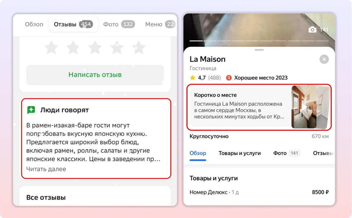 Так, в 2025 году можно говорить о том, что клиенты в перспективе будут обращать внимание на особенности и преимущества бизнеса, не читая десятки отзывов в одном источнике. Из минусов — предсказать, что именно попадет в саммари или карусель с фото, невозможно. Также будет довольно трудно повлиять на то, чтобы саммари изменился сразу после того, как вы решили проблему.