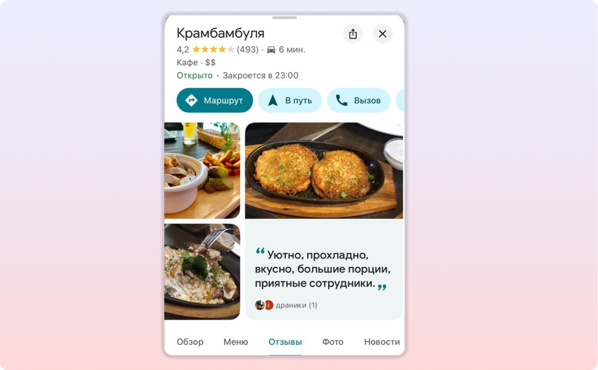 В Google это реализовано немного иначе. В 2024 году в карусели фото в карточке стали показываться цитаты из отзывов, которые по оценке алгоритмов являются наиболее релевантными для пользователей.