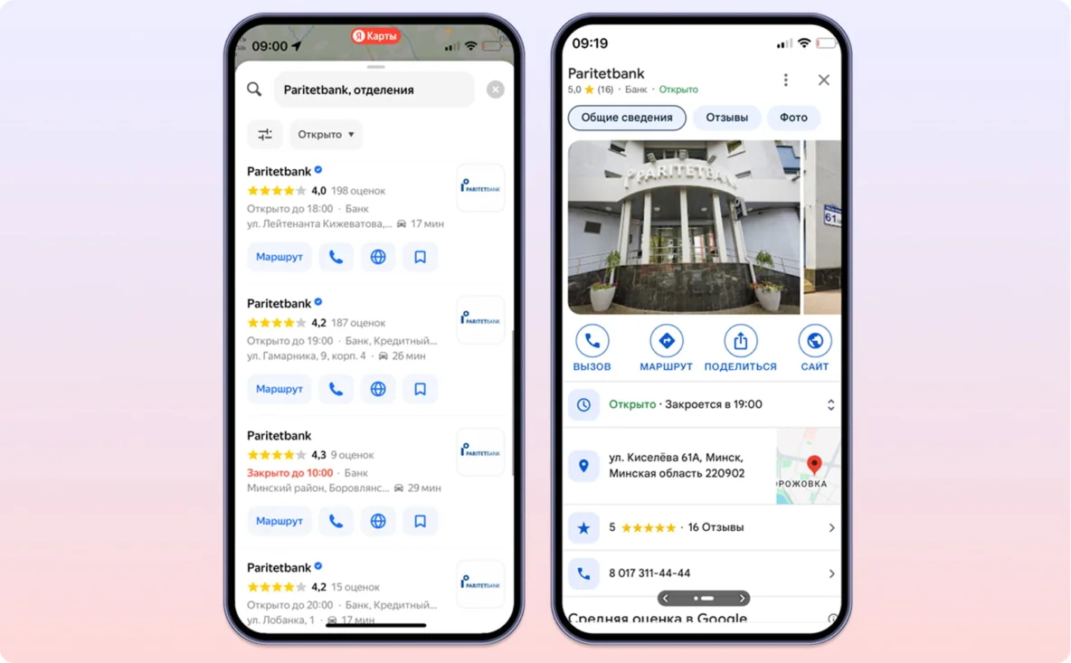 — Карты — это инструмент, который позволяет нам конвертировать пользователей в реальных клиентов. Поэтому важно, чтобы нас находили на картах, видели хорошие отзывы и приходили в отделения Paritetbank, — объясняет цель проекта Татьяна Кузьменко.