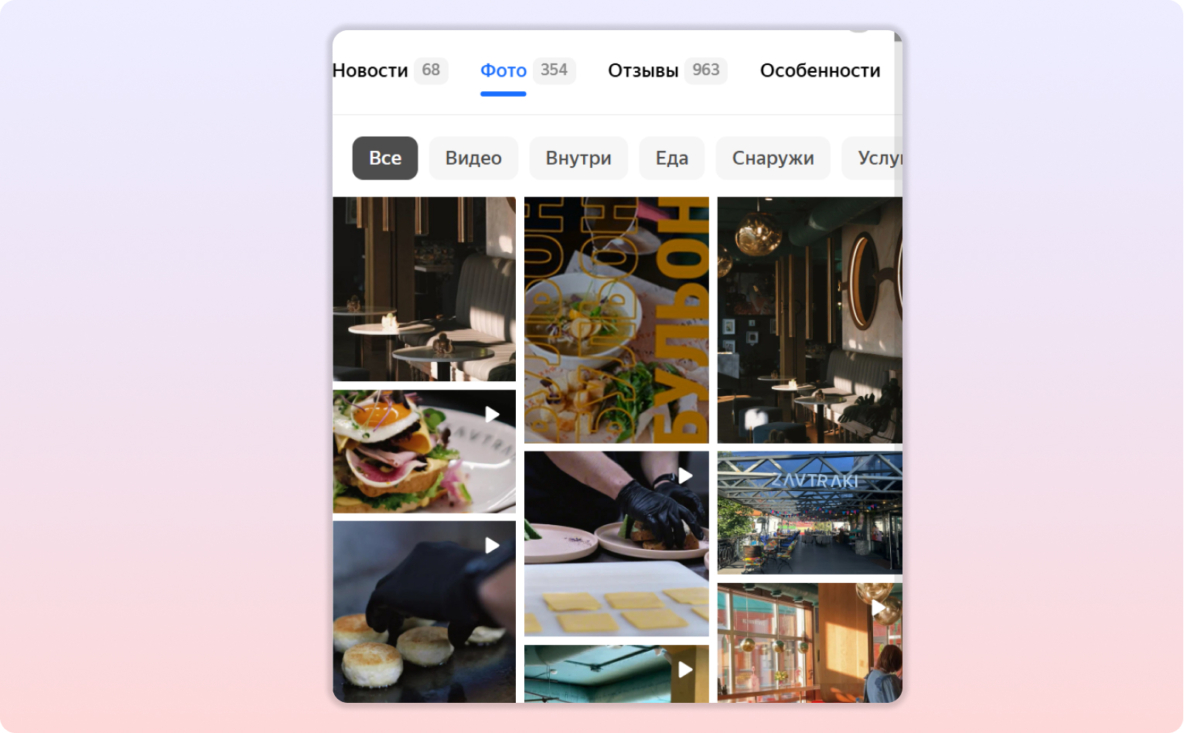 Карточка — «витрина» вашей компании, которая должна демонстрировать не только продукт или услугу, но и другие аспекты, которые могут быть важными для посетителей: стилистика интерьера, наличие летней террасы или возможность зарядить телефон или ноутбук.