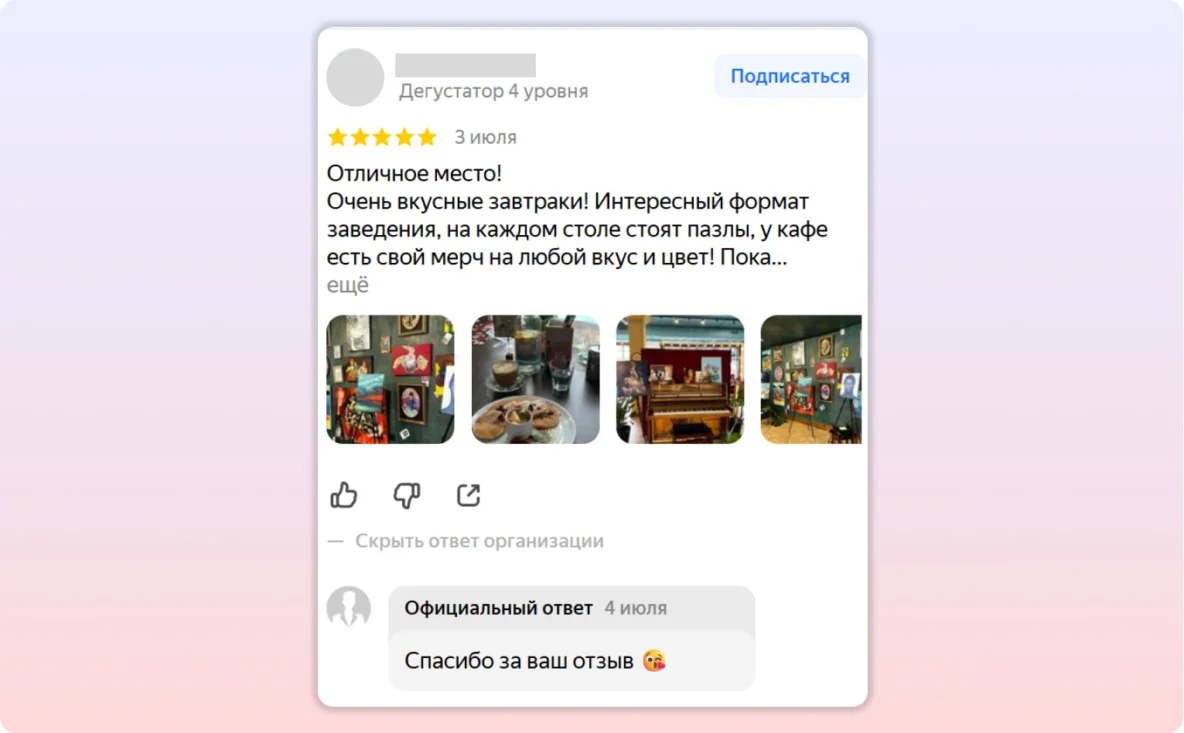 Иногда компании вставляют в ответы ключевые слова в надежде улучшить ранжирование (например: «Спасибо за отзыв! У нас действительно уютная кофейня с десертами и видом на город!»). Но это не работает — алгоритмы учитывают только то, что написали о вашем бизнесе клиенты в отзыве.