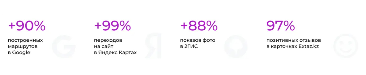 Яндекс Карты пока имеют лишь долю влияния 3% в Казахстане, но работа с ними через RocketData дала Extaz.kz конкурентное преимущество и привела к росту целевых действий.
